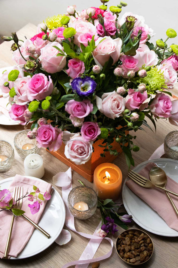 Combining the simple and elegant flowers such as pink roses along with lisianthus to look modern. A beautiful arrangement for your tablescapes during the festival season. These make perfect gifts as well.