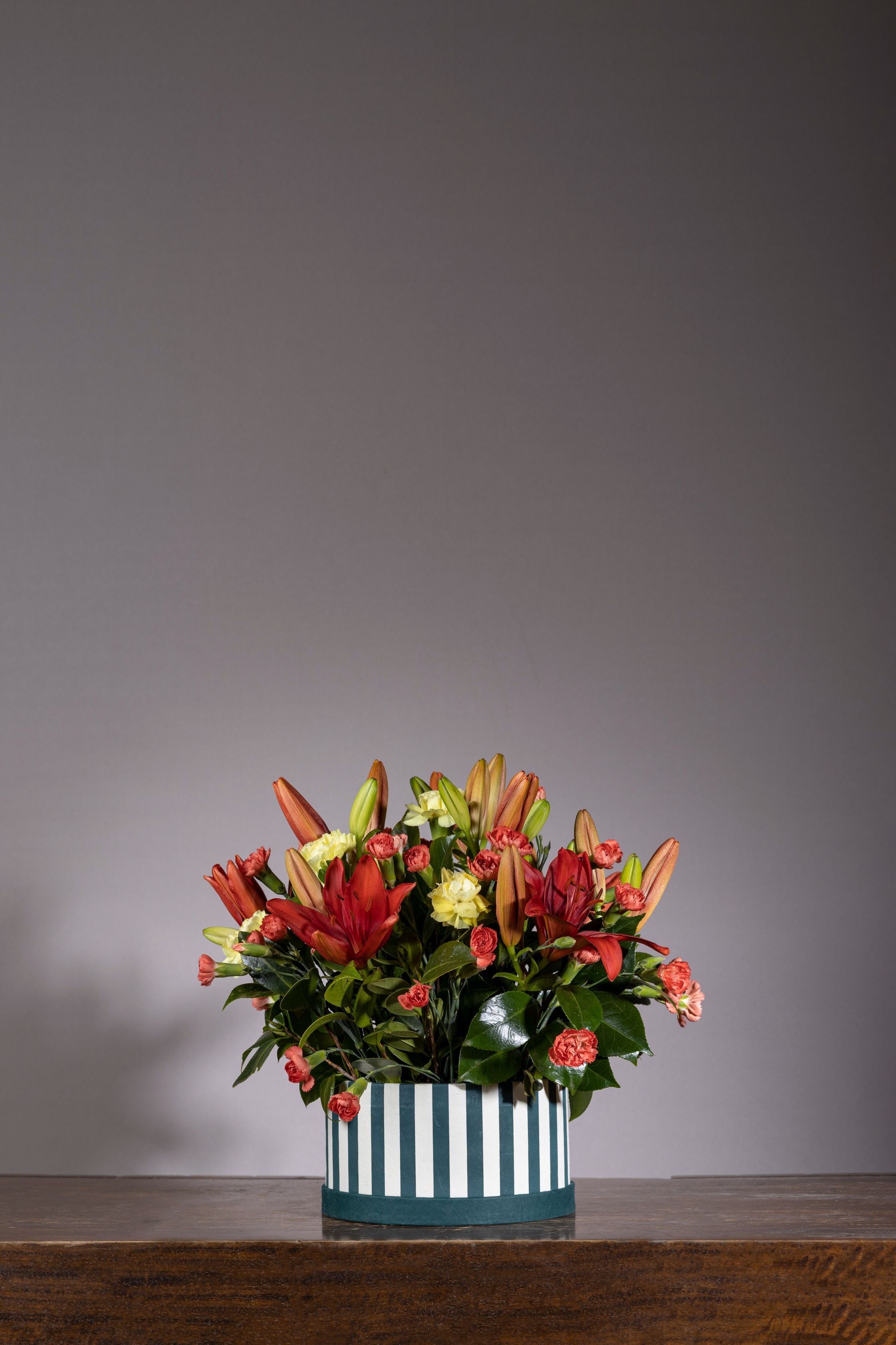 A custom signature keepsake box holds Manuy Maroon Lilies and Yellow Carnation blossoms with curious and exotic foliage