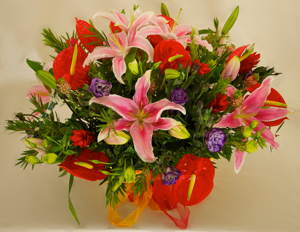 A tray filled with beautiful oriental lilies, red anthuriums and beautiful fillers is for someone to whom you want to express eternal love.