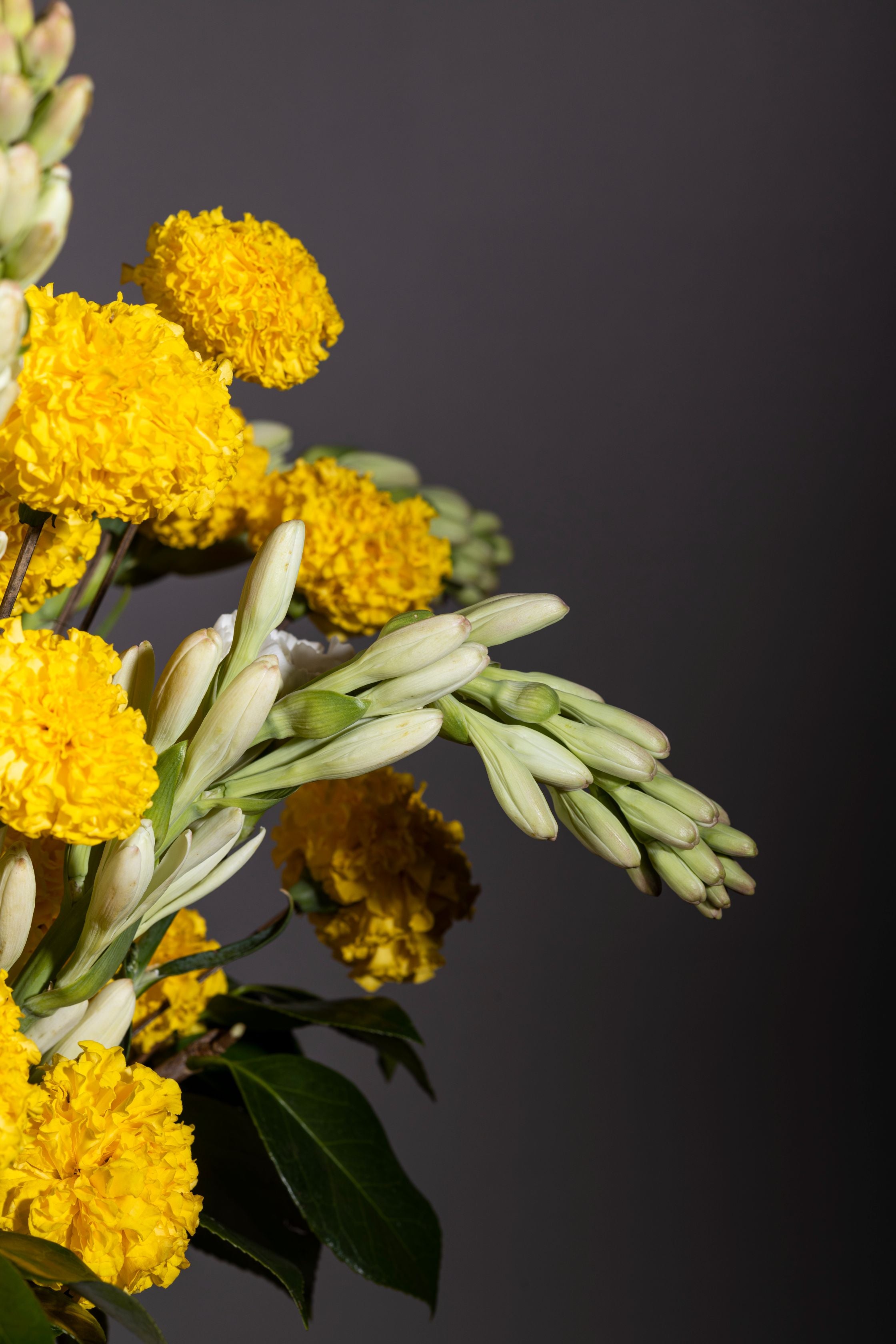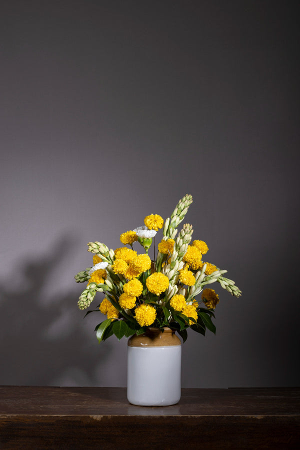You won't be in a pickle with this jar full of succulent Yellow Marigold flowers and heady Tuberoses