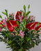 This beautiful glass container with wonderful detail tells a story of love that does not end. Red Anthurium with Pink Oriental Lilies matched with Pink Berries and a bed of green fillers have a compelling message