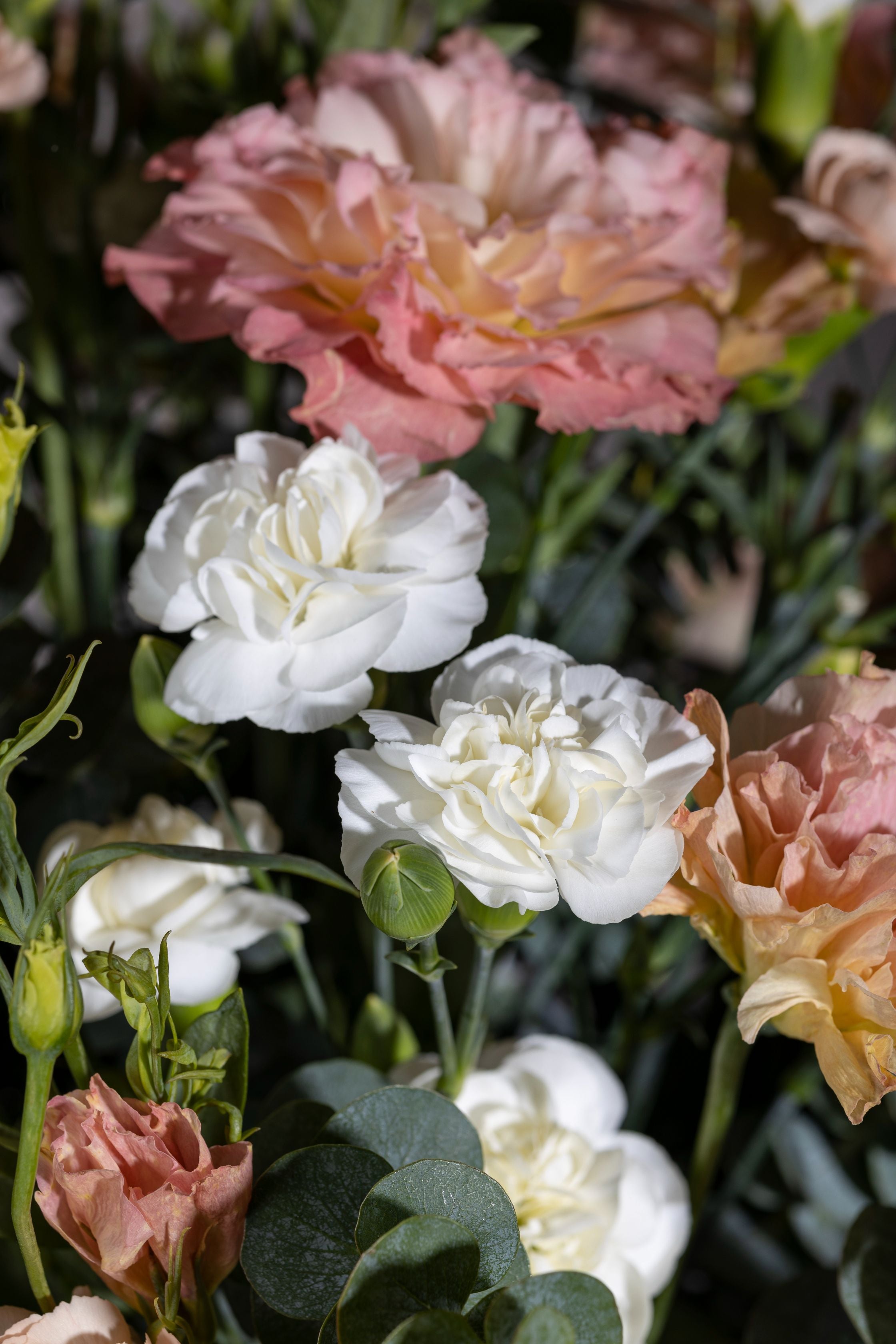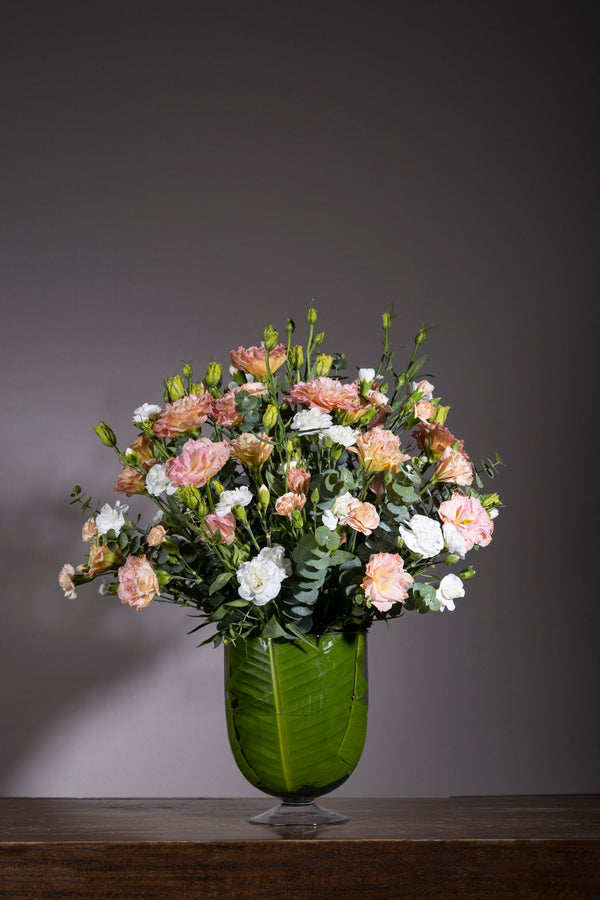 Life is peaches and cream with this bell jar of Peach Lisianthus flowers in the serene company of White Carnations blooms along with interesting foliage