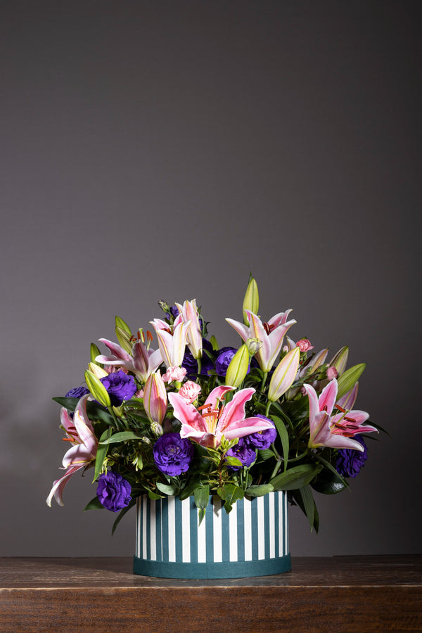 A custom keepsake hat box makes a romantic overture with aromatic Pink Oriental Lilies and Purple Lisianthus blooms and then some foliage