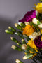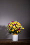 Soft but powerful arrangement that features yellow Roses, Purple Carnation stems and White spray Carnation stems in a pickle jar