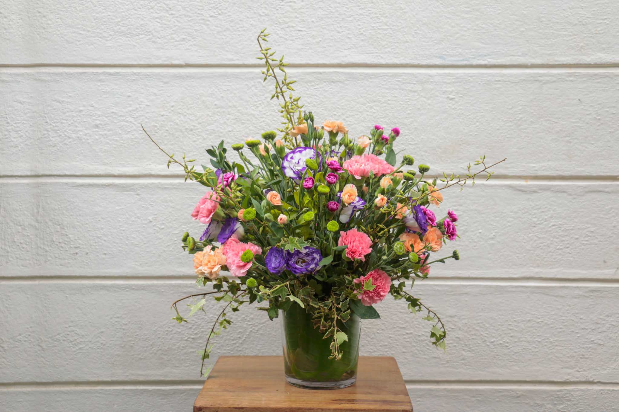 Combining beautiful flowers such as carnations, lisianthus and spray carnations make this a beautiful arrangement for any one to behold.