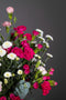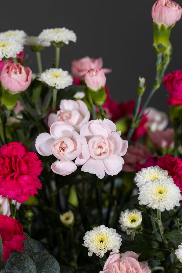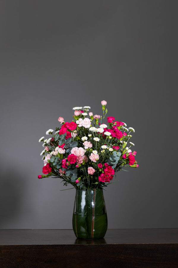 An oval glass vase calls out with its Sprays of Dark Pink Carnations, Light Pink Carnations mixed with White Chrysanthemum flowers