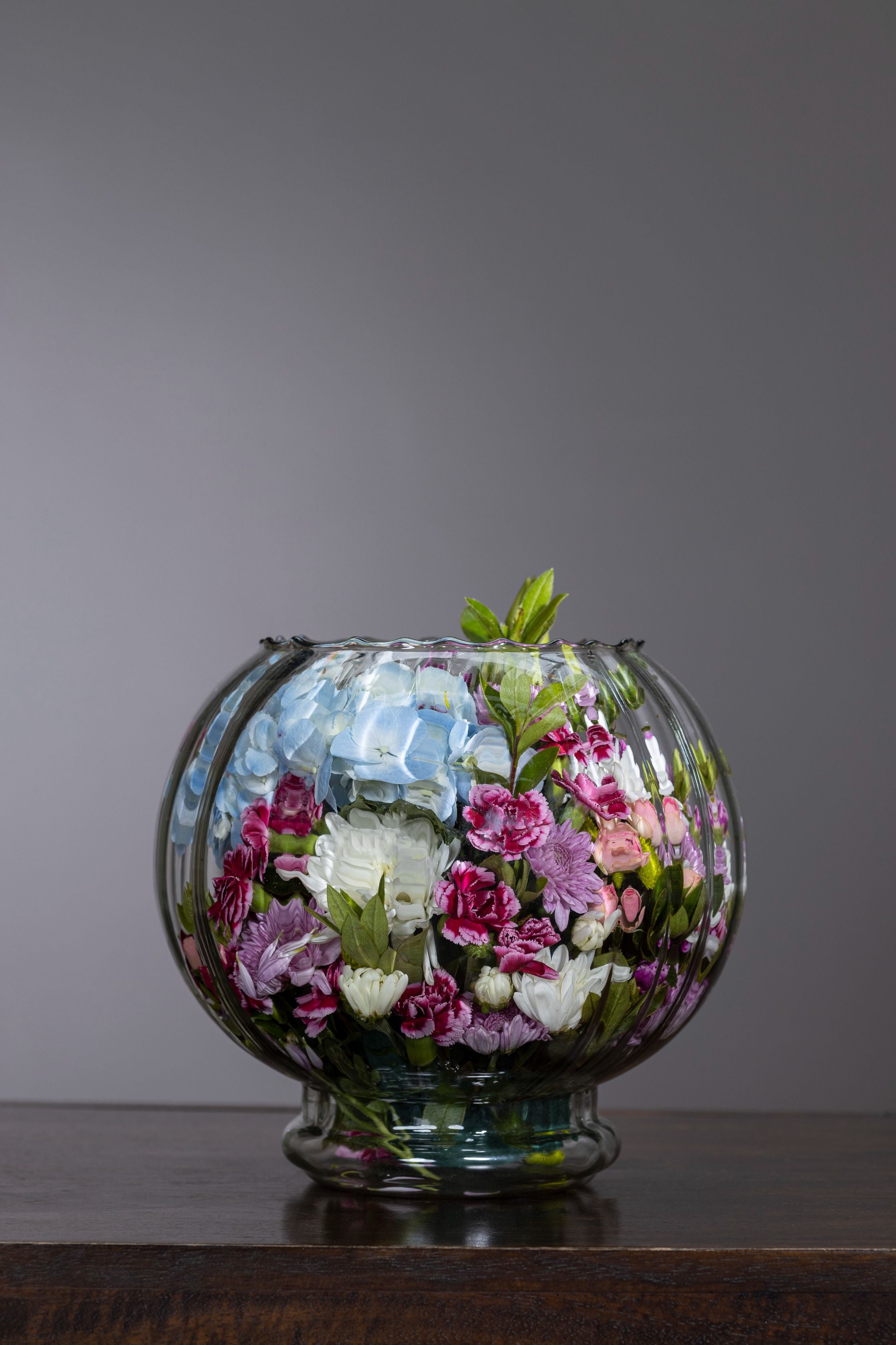 A glass fish bowl sparkles with life as it lets Spray Carnation blossoms and Blue Hydrangea swim freely in its midst