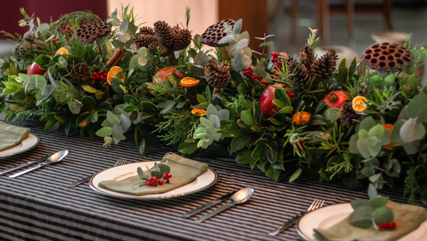 A beautiful table arrangements of the freshest greens such as eucalyptus cypress pine cones and lotus pods and cinnamon sticks