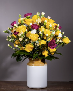 Combining the simple flowers such as yellow roses and spray carnation to look modern. A beautiful arrangement for your tablescapes during the festival season. These make perfect gifts as well.