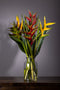 A lovely glass biscuit jar sports the most fabulous, tall and regal Heliconia flowers in multiple colours. A bonanza of beauty any day