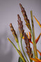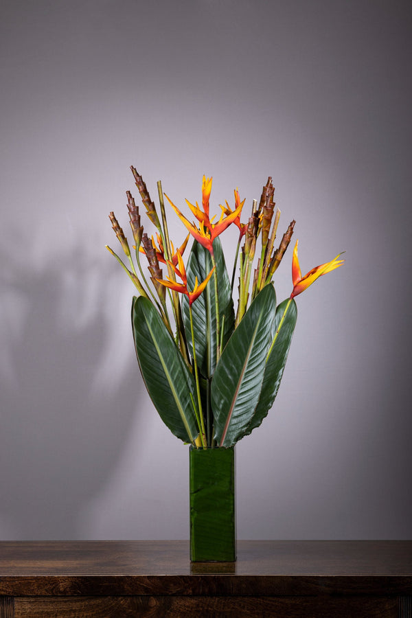 A medium heigt square glass vase with a blend of Calatheas and Baby Heliconia flowers amidst an undergrowth of Bird of Paradise leaves is an essence of beauty