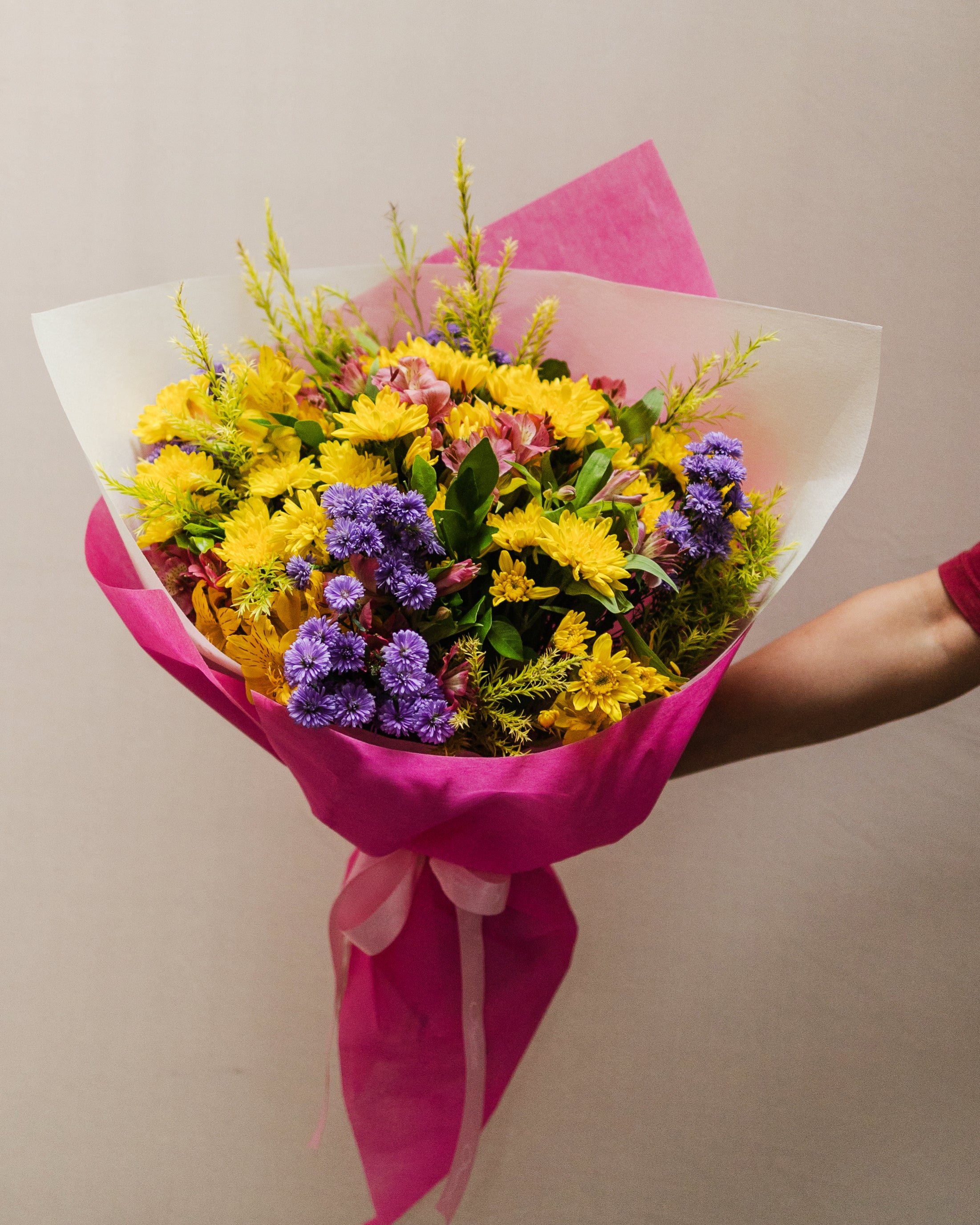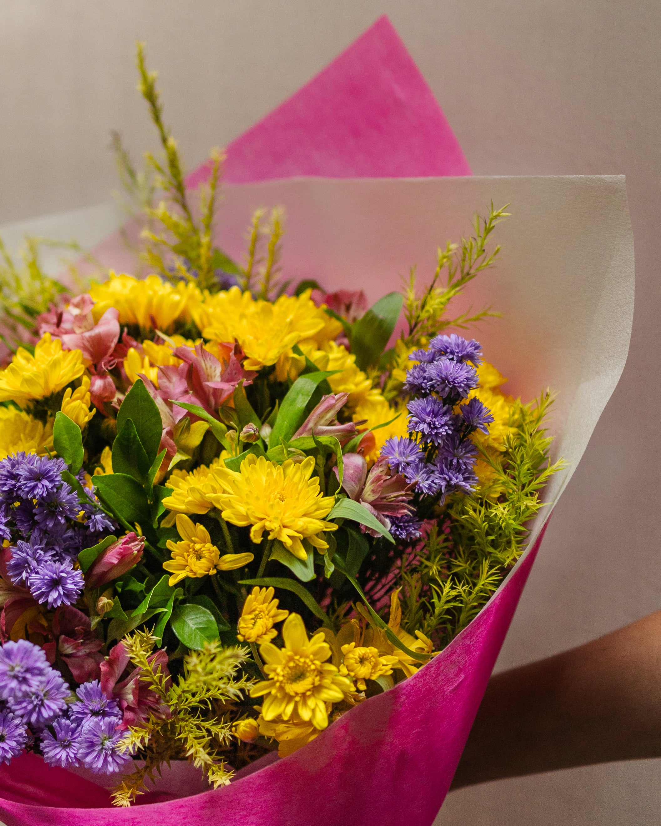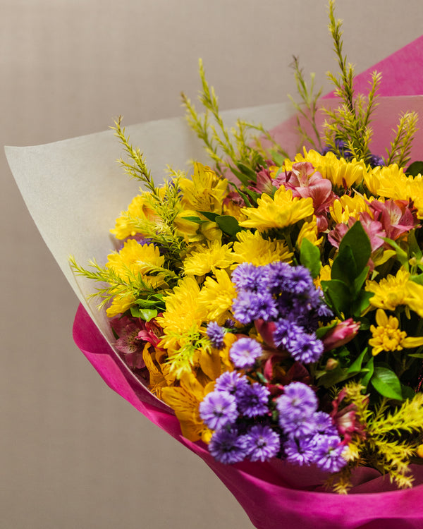 A beautiful assemblage of mixed flowers such as chrysanthemums, blue daisies and other fresh fillers.