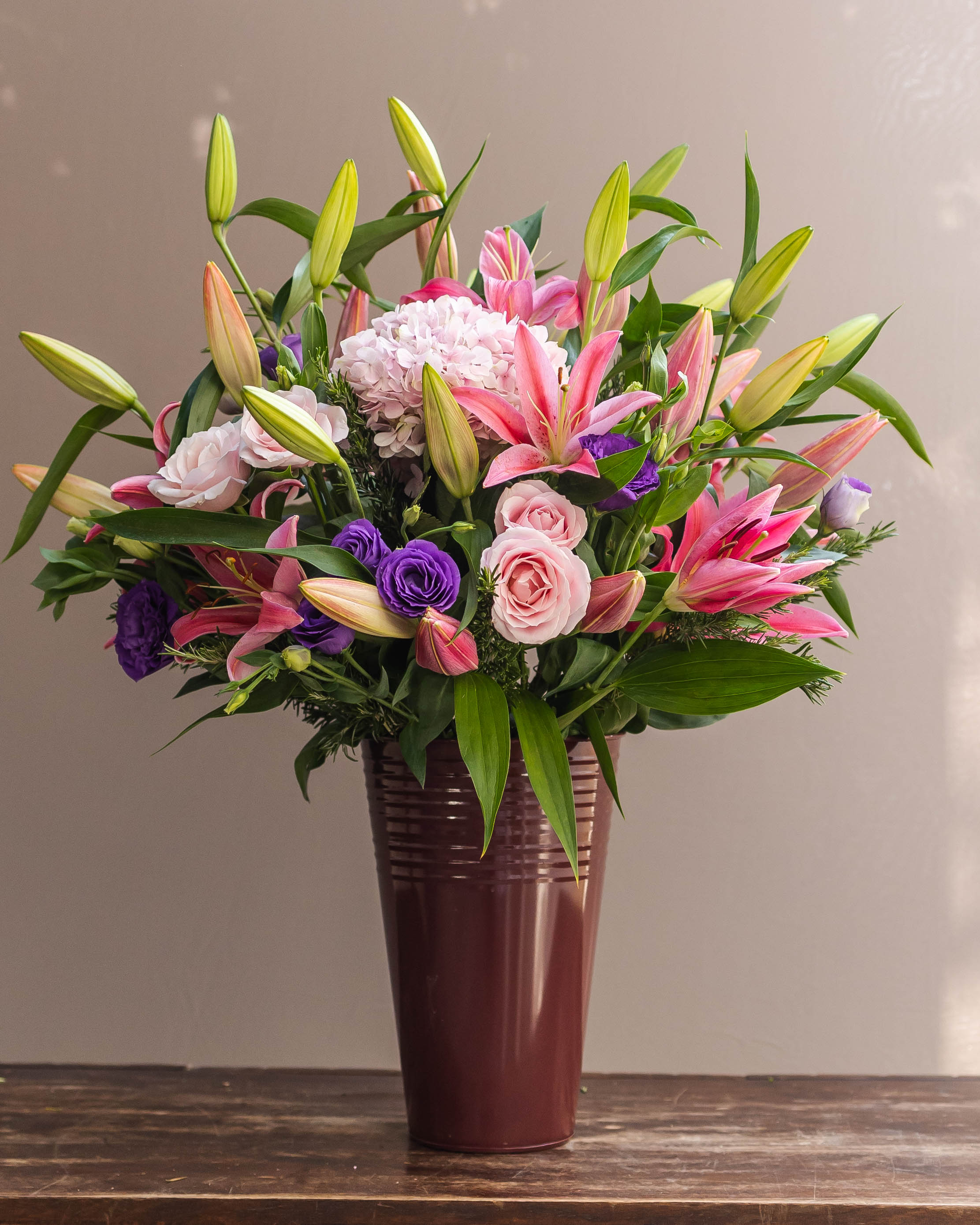 Love is a complete package. So does this plush and cozy arrangement of Pink Fragrant Orientals and pale pink Hydrangeas. A great many Green Fillers ccomplete the story