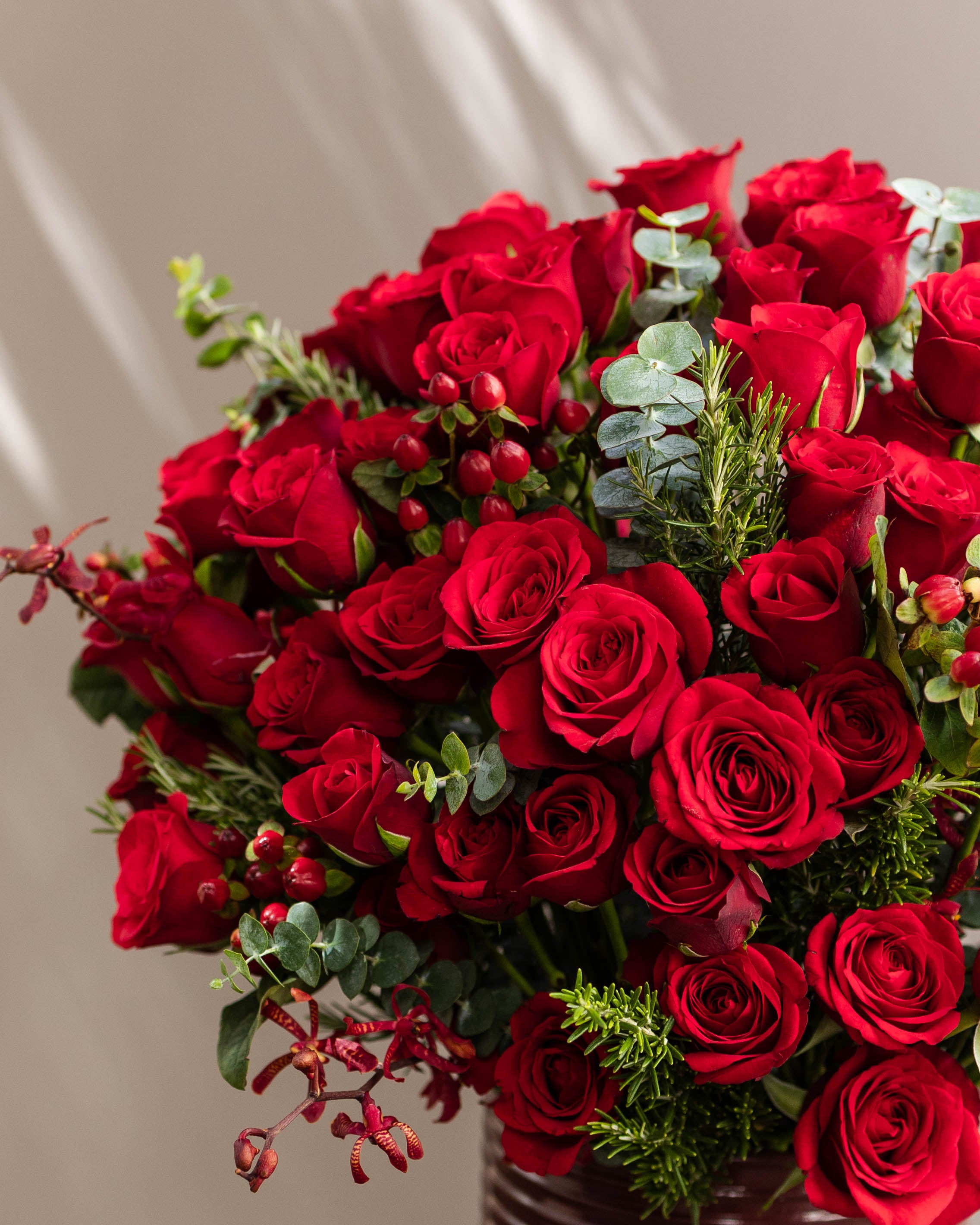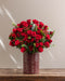 Dreaming of you and you alone today and everyday ? A prolific bunch of Red Roses arranged tightly in a beautiful custom colourul tin with a lush bed of green fillers