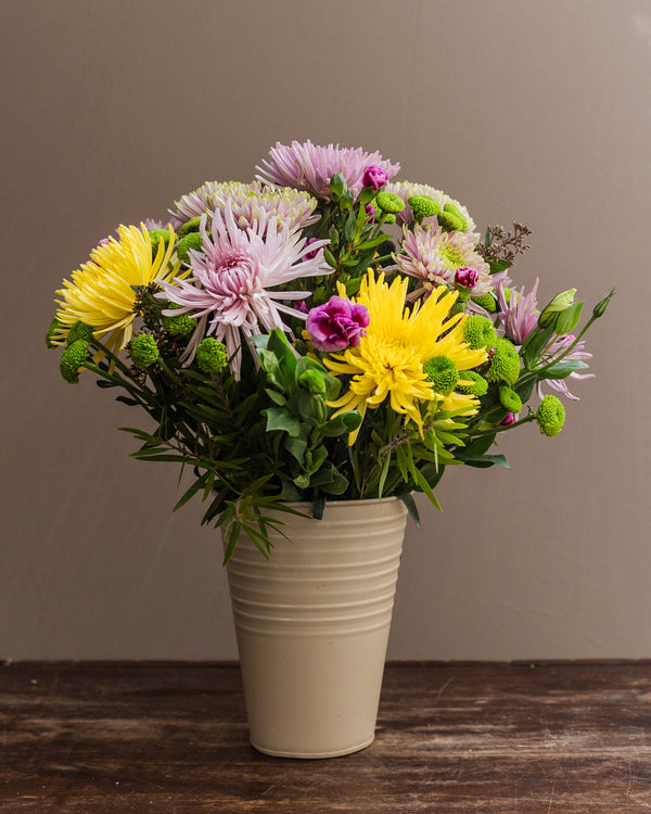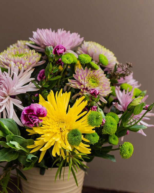 Loves knows many shades but affection is common to it all and it runs deep. Disbud chrysanthemums in various hues along with green button chysanthemum and beautiful green fillers make this valentine arrangement special