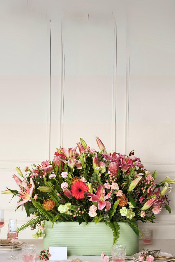 WOW. What a spectacular arrangement of oriental lilies gerberas queen proteas sprays of carnations, berries and a beautiful selection of green fillers. Truly a mixing of wild bunch of eclectic flowers.