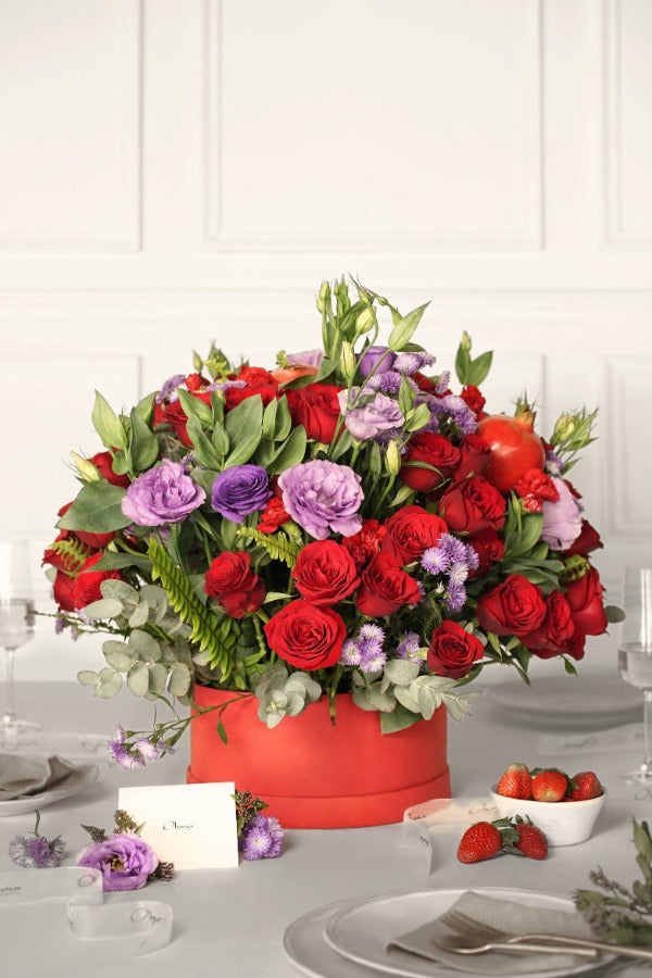 Gorgeous RED hatbox with bright red roses accentuated with mauve lisianthus and with a hint of purple diasies. Adding to the sweet madness is juicy ripe pomegranates