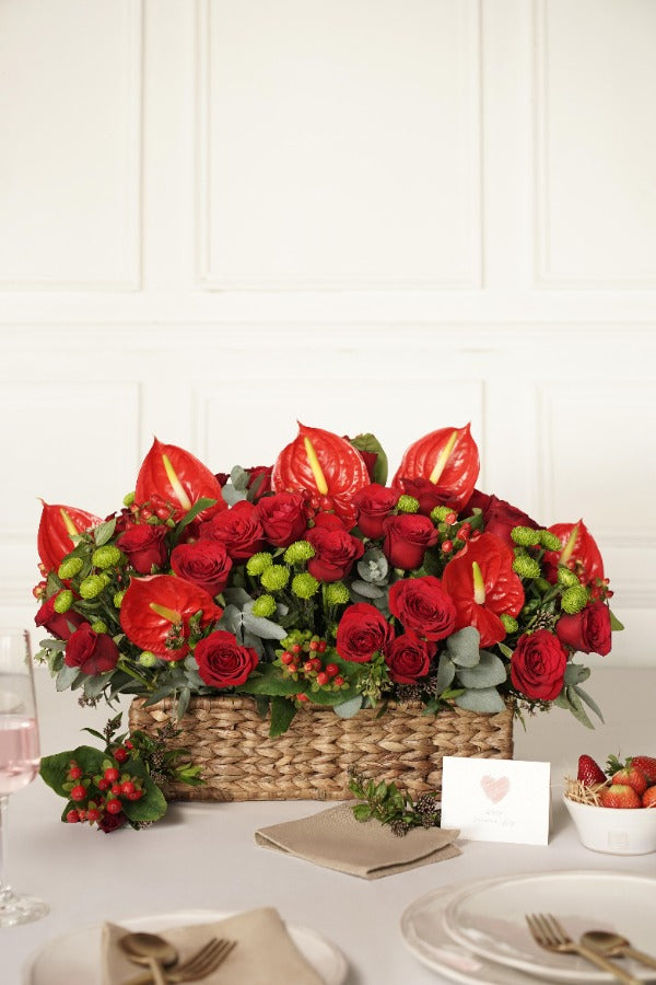 A beautful water hyacinth basket filled with anthurims which are naturally heart shaped and mixed with the choicest roses and green chrysanthemums. Lovely arrangement for your loved one.