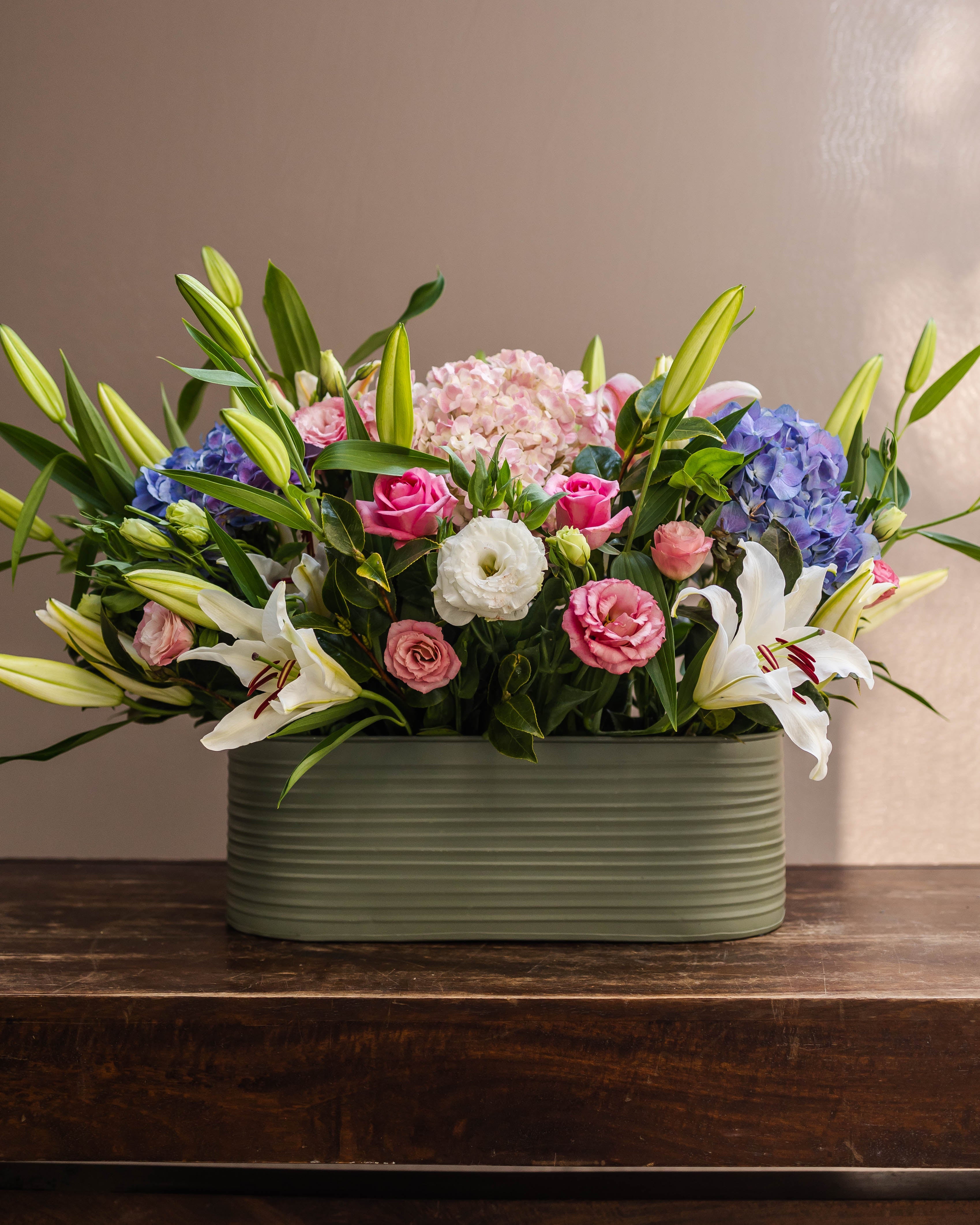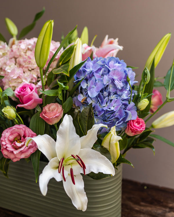 Going above and beyond are these tinful of beautiful flowers for you and your loved one. Pink and white Oriental Lilies with pink lisianthus in the inspiring company of pink and blue hydrangeas