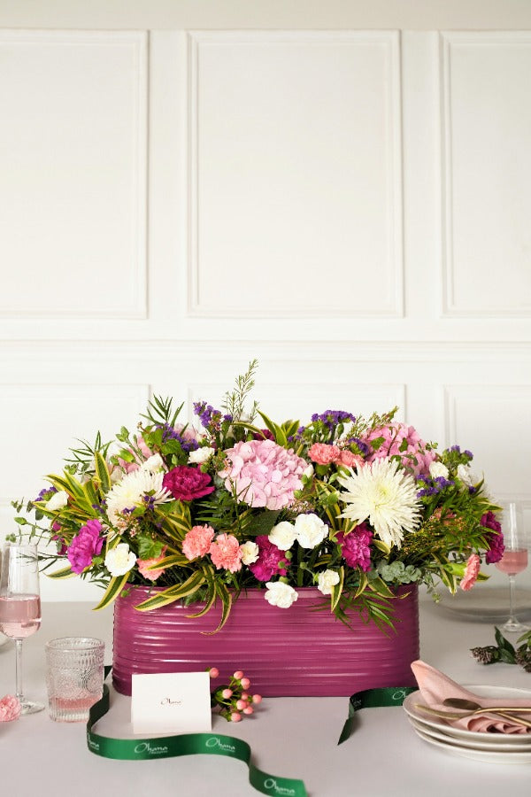 Truly a wild one. A wild mix of all the beautiful blooms such as chrysanthemums, sprays, hydrangeas, carnations and mixed fillers brought together in this magenta tin.