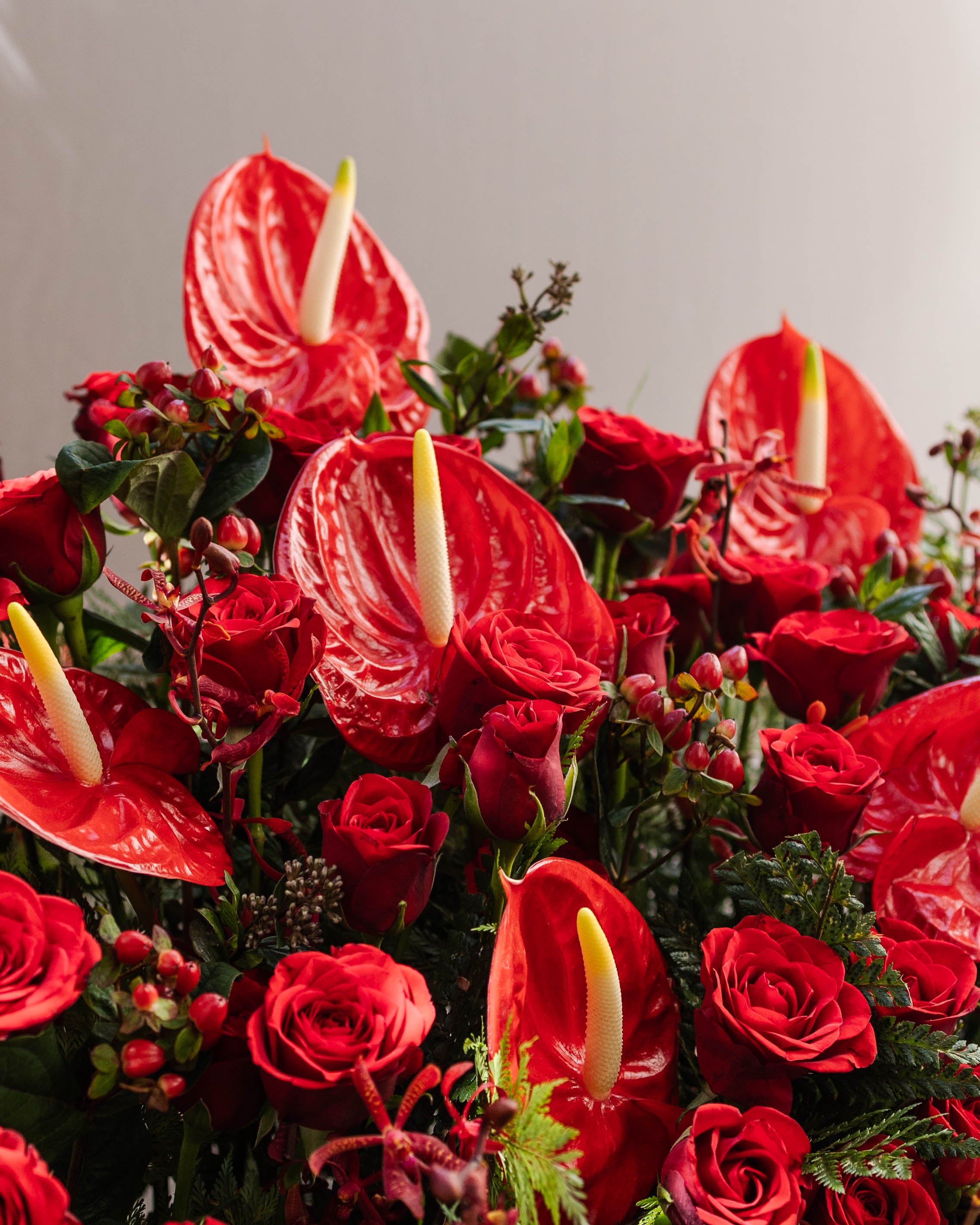 My heart beats for you, these heart-shaped Anthurium flowers seem to say! Red roses nestled on a bed of green fillers are sure to make your heart skip its beat just for a moment. Love you Truly Madly Deeply