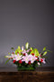 A charming long and low centerpiece arrangement with aromatic Oriental Lilies in concert with Spray Carnation and Eustoma flowers in glass container