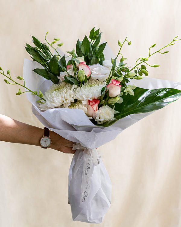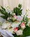 This serene bouquet of all white and pastel colours is truly a beautiful surprise for Spring. Beautifully wrapped in white paper and can be given for any solemn occasion too