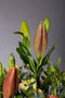 Many bushy stems of Asiatic Red Lilies dotted with plentiful baby Chrysanthemum flowers in a lovely custom glass container ready to grace your space