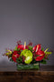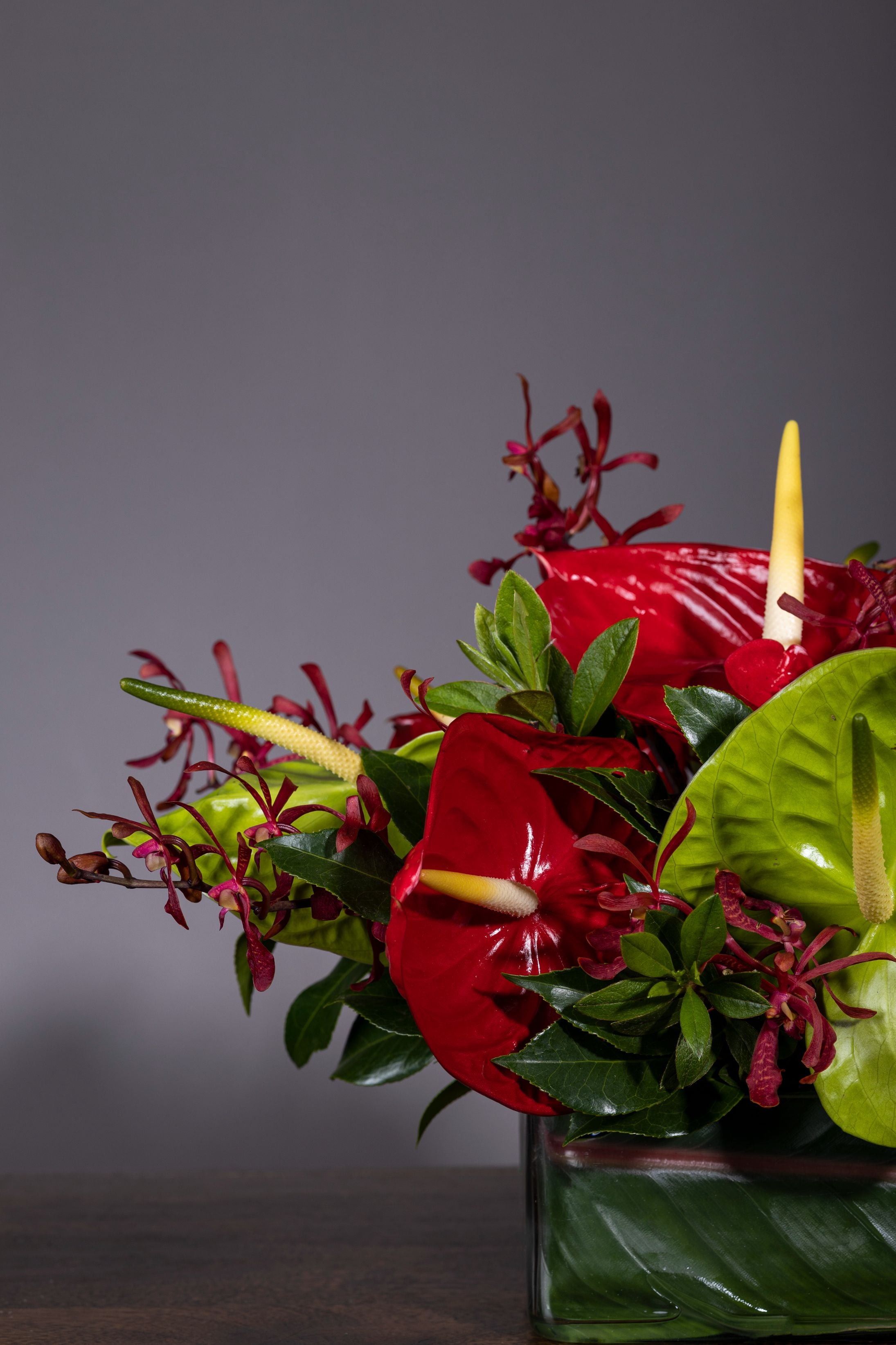 Red and Green Anthurium flowers and Red Orchids are the center of attention here in this beautiful centerpiece arrangement. Gracefully arranged in a long and low glass container
