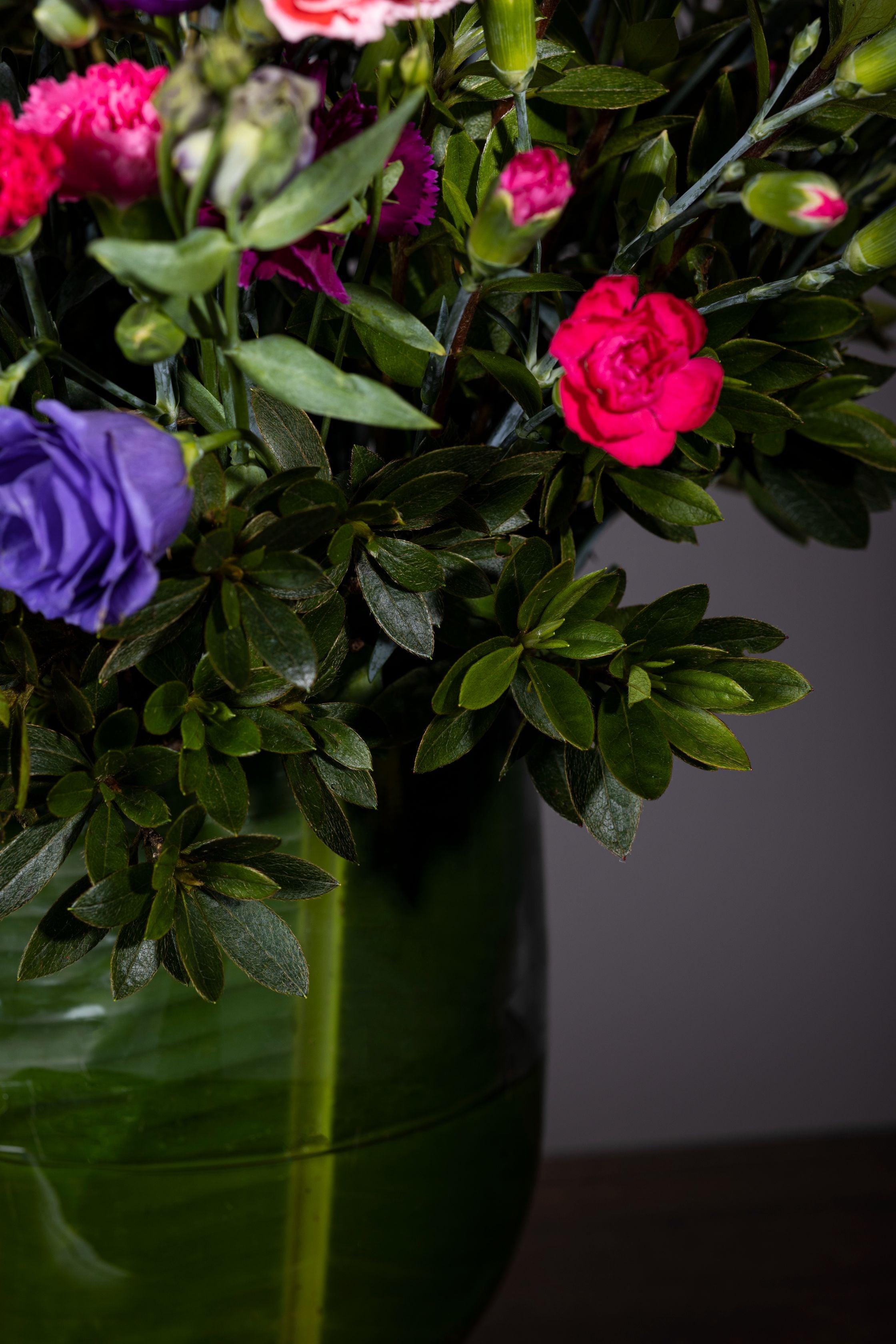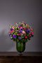 A custom glass bell jar holds a lot of surprises with a beautiful blend of Spray Carnations and Eustoma blooms. An unmistakable beauty in any corner