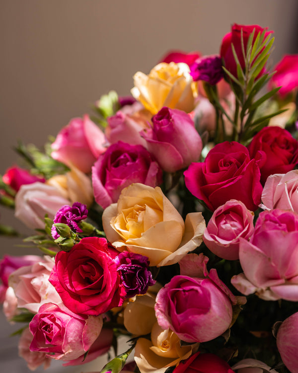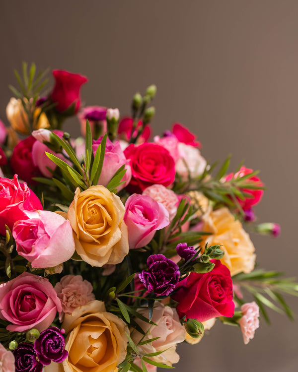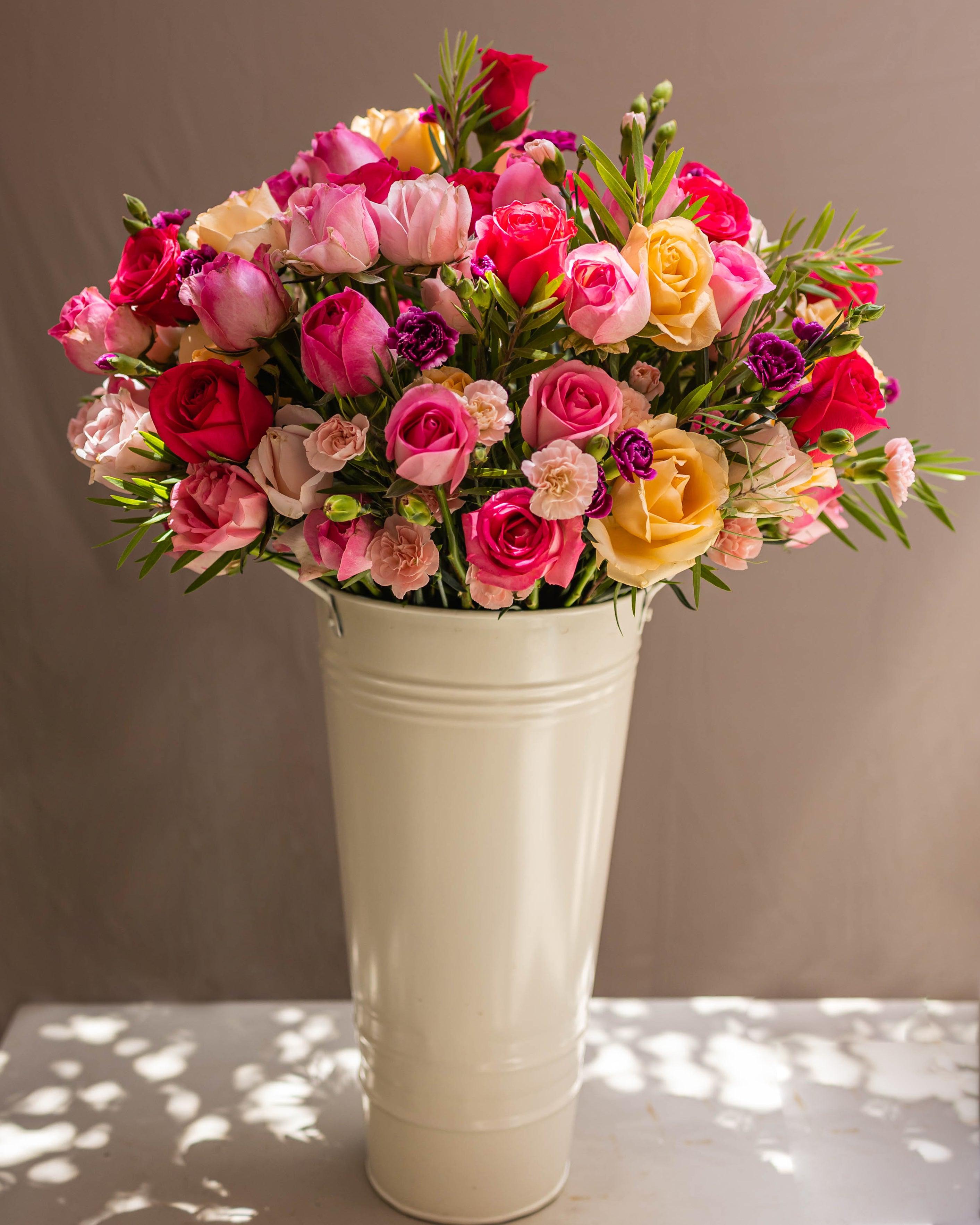 An enchantingly beautiful garden tin comes to you full of bunches of colorful Roses, Spray Carnations in a luxuriant arrangement to add colour to any space.
