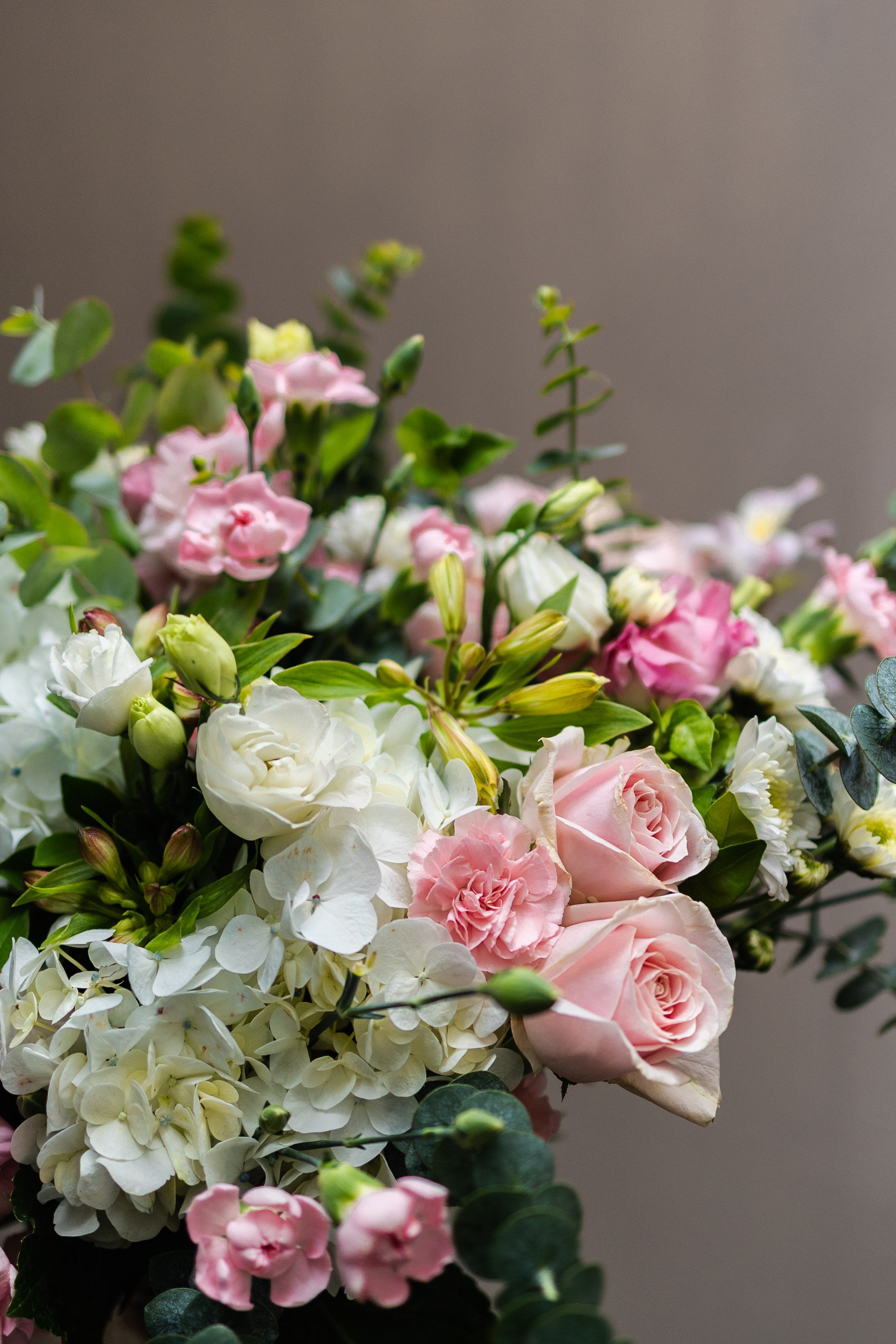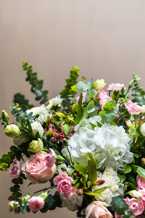 A beautiful hand-tied bouquet of pink roses, hydrangea and fillers