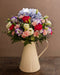 A speically powder-coated keepsake metal tin that is timeless comes to you filled with the freshest of flowers including Hydrangea flower bundles, Eustoma or Lisianthus flowers and Spray carnations.