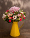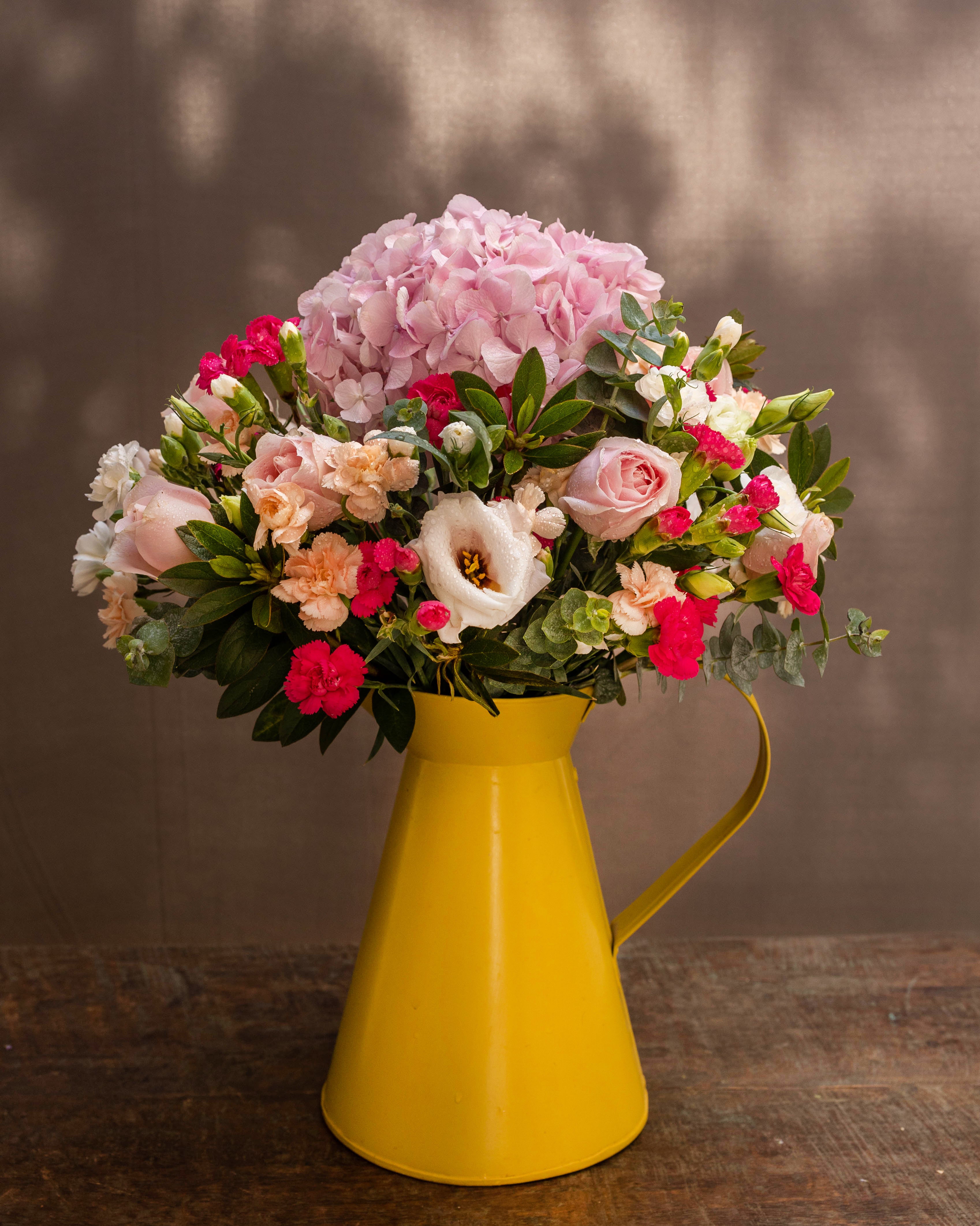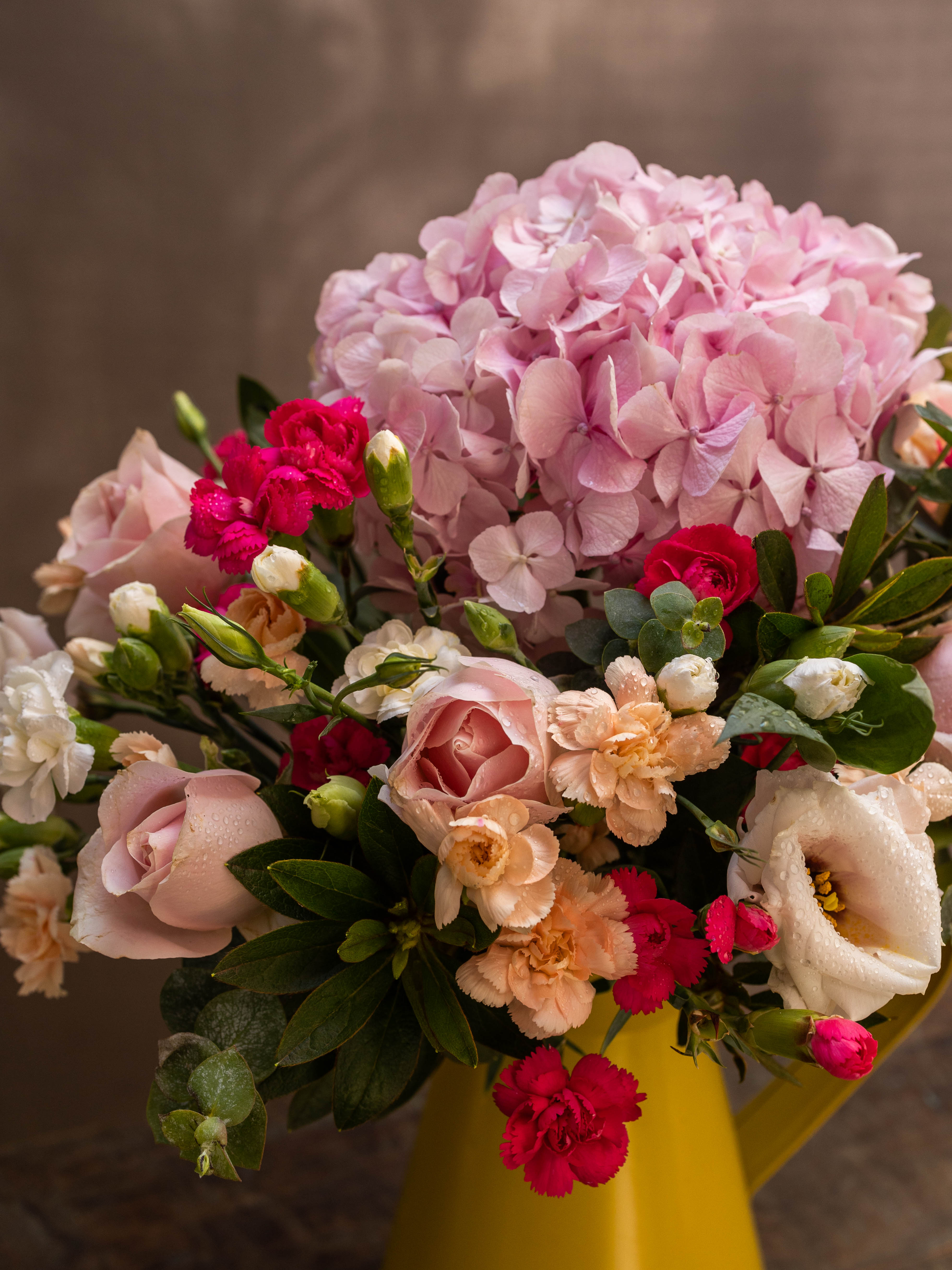 A specially powder-coated keepsake metal tin sports a delicate oasis of the choicest blooms such as Eustoma or Lisithusan, Hydrangea flower bundles along with long-lasting Carnations ready to decorate a table or a cozy and tranquil corner.