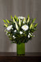 A sleek glass vase with White Oriental Lilies, Disbuds white Chrysanthemum flowers in nostalgic company with white Spray Carnation flowers