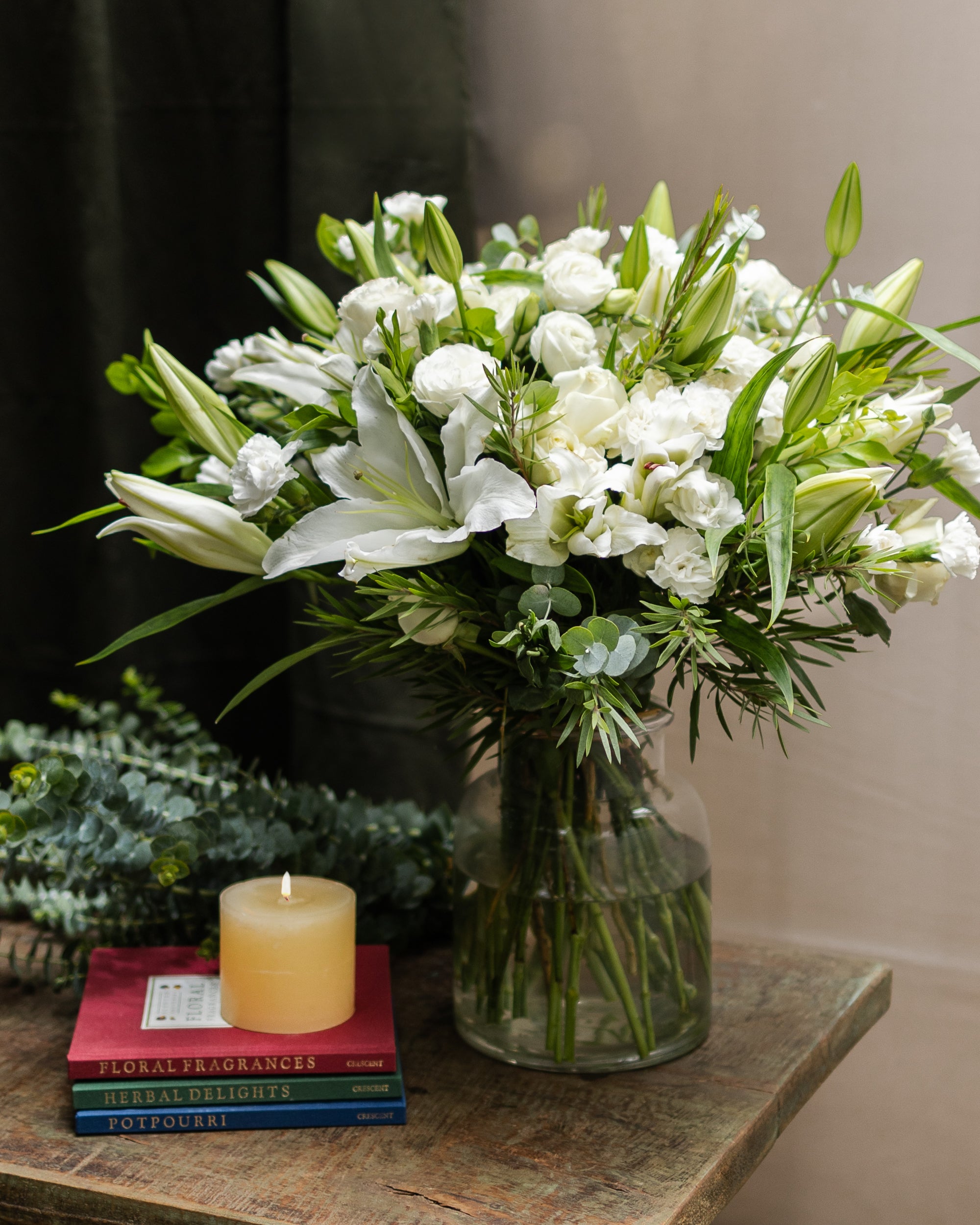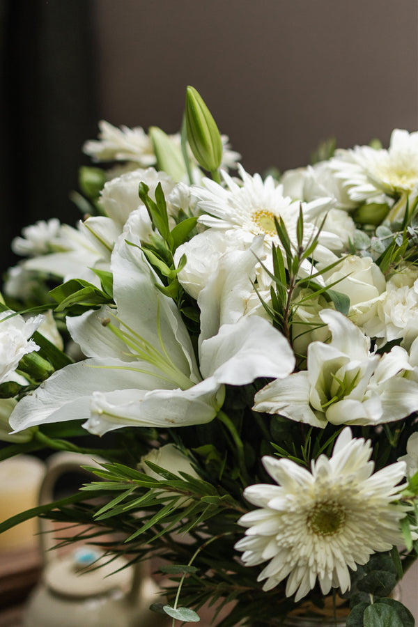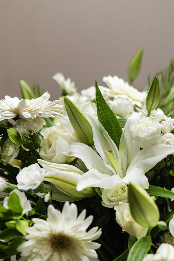 A beautiful hand-tied bouquet of oriental lilies, white carnations, and bright and beautiful fillers.
