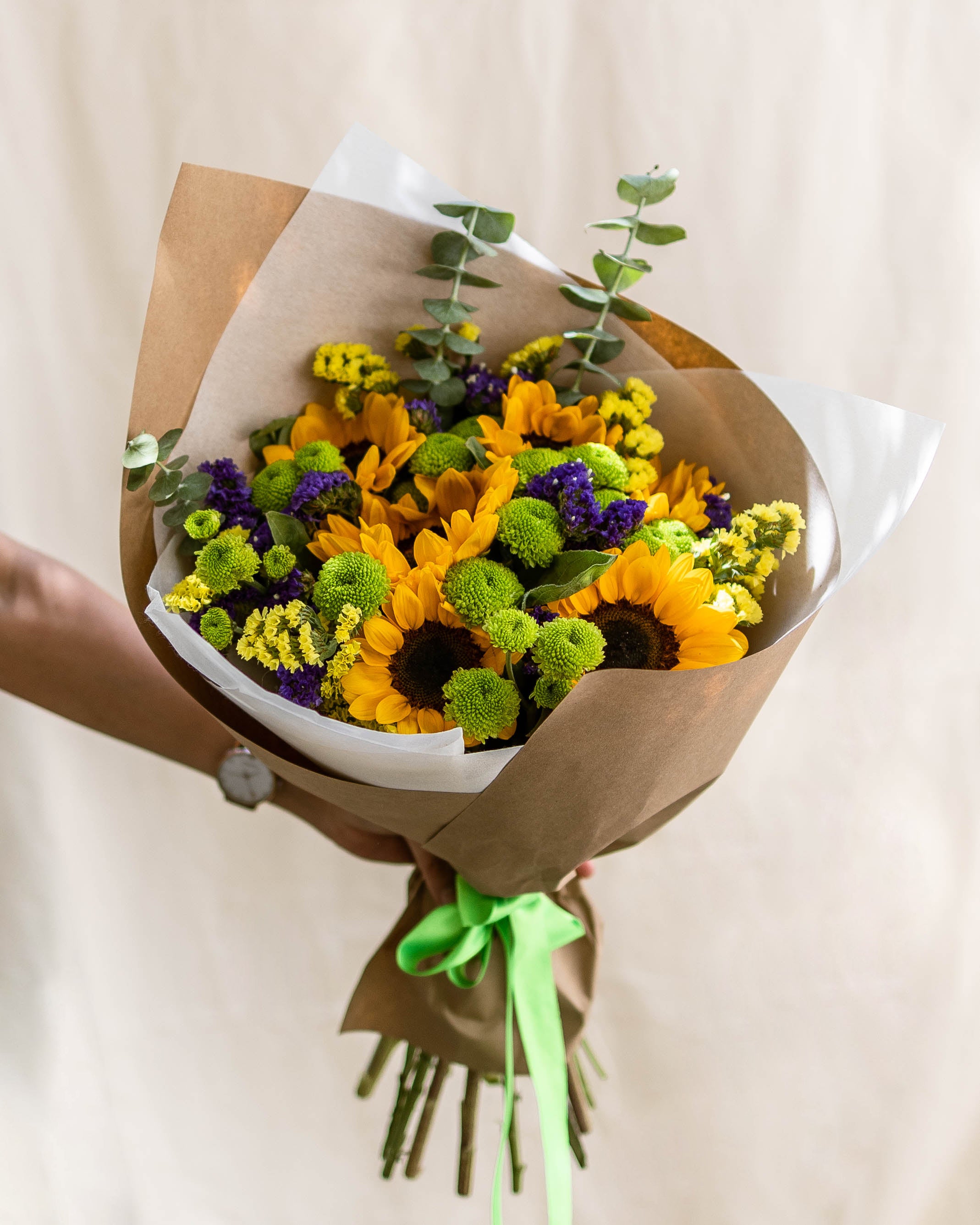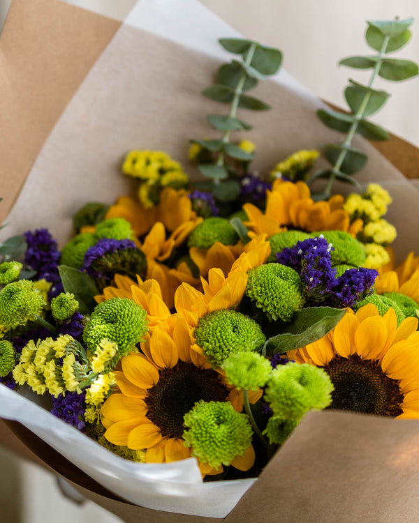 A sunshine bouquet of yellow sunflowers and green chrysanthemums and yellow statice makes this such a happy bouquet. Wrapped in brown paper and a beautiful green ribbon this bouquet will anybody smile.