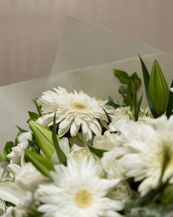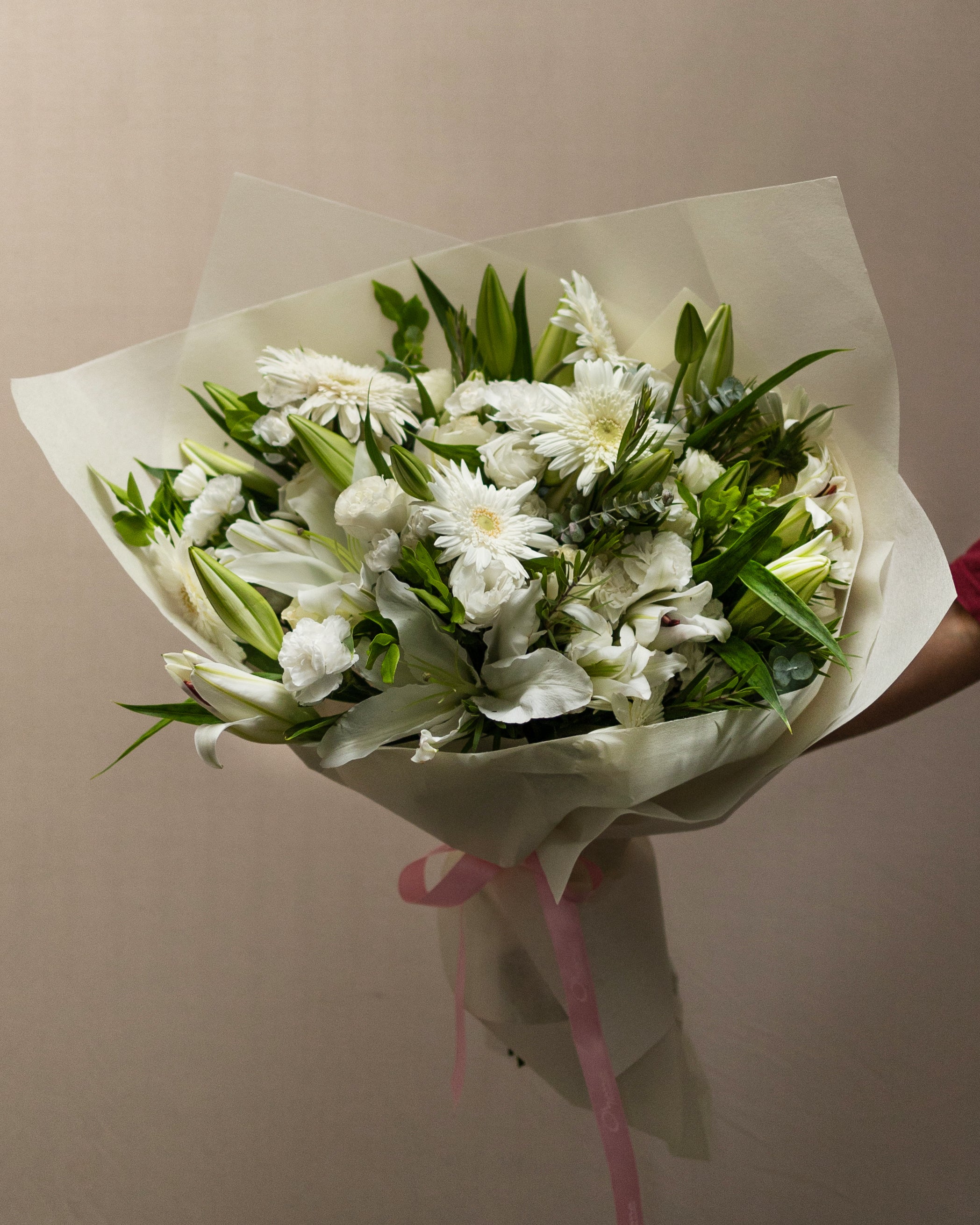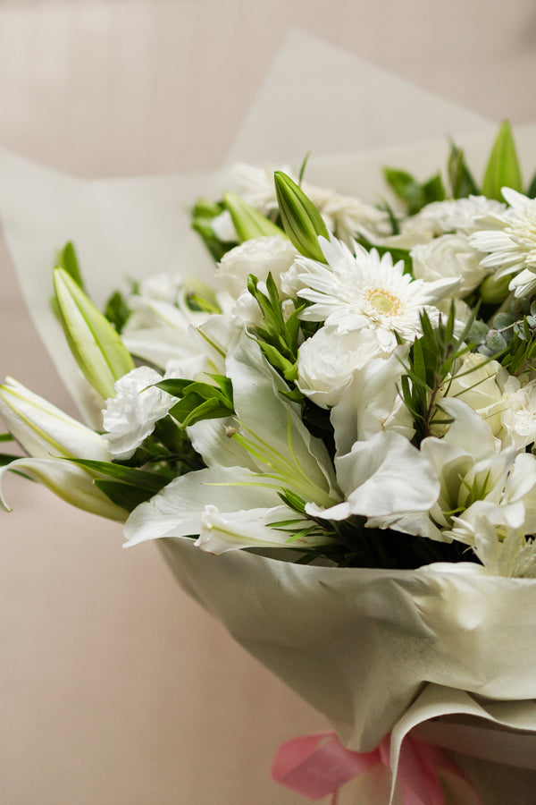 Beautiful & calming bouquet of all-white flowers, white oriental lilies, white gerberas, and white spray carnations.