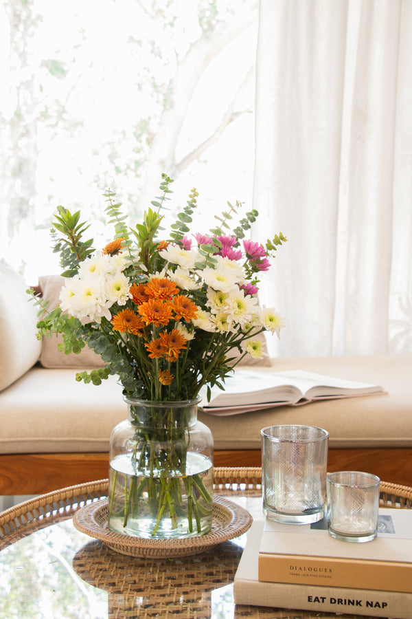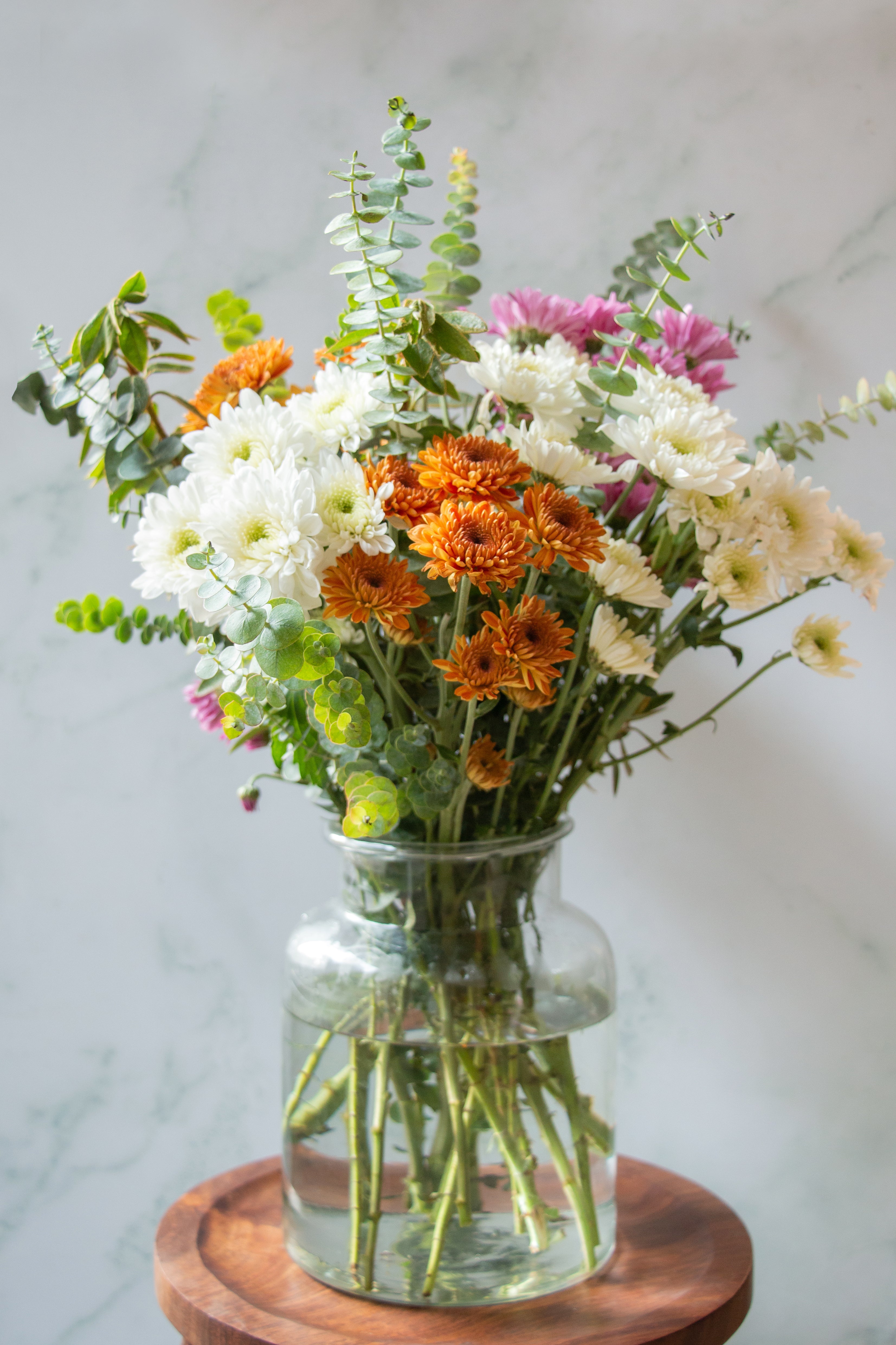 1. CHANGE THE WATER IN YOUR GLASS CONTAINER AND TRIM THE STEMS EVERY 3 DAYS.