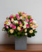 The soft shades of the fresh flowers in this wonderful and cozy tin wafts the aroma of love like no other. Pink Roses and Peach Roses along with Light Pink Carnation and Dark Pink Carnations cover the gamut