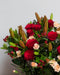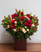 At the height of passion, all rules break loose. In this high temparature arrangement, deep Red Lilies, bright Red Roses join hands and hearts with Peach Spray Carnations and unmistakably Red Hypericum berries in a beautiful square tin